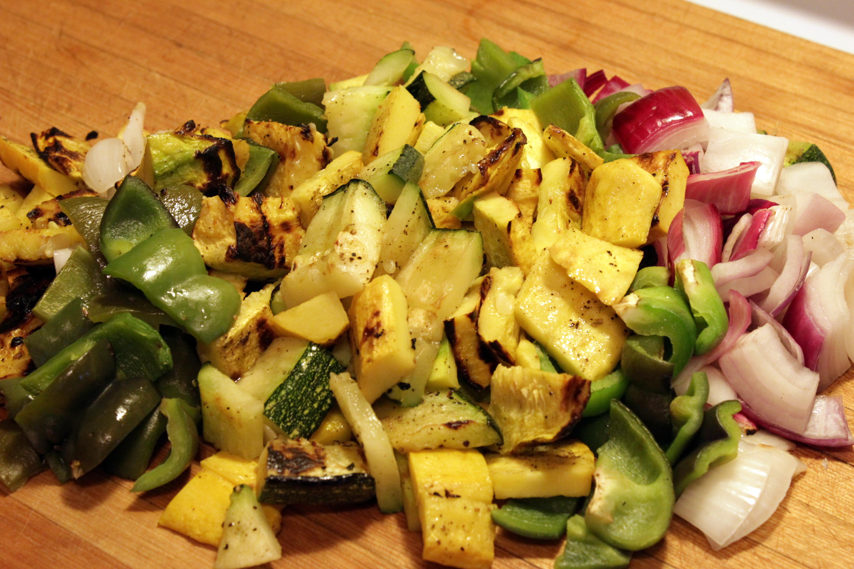 3. Cut grilled veggies into 1/2 to 3/4″ chunks and set aside to cool.