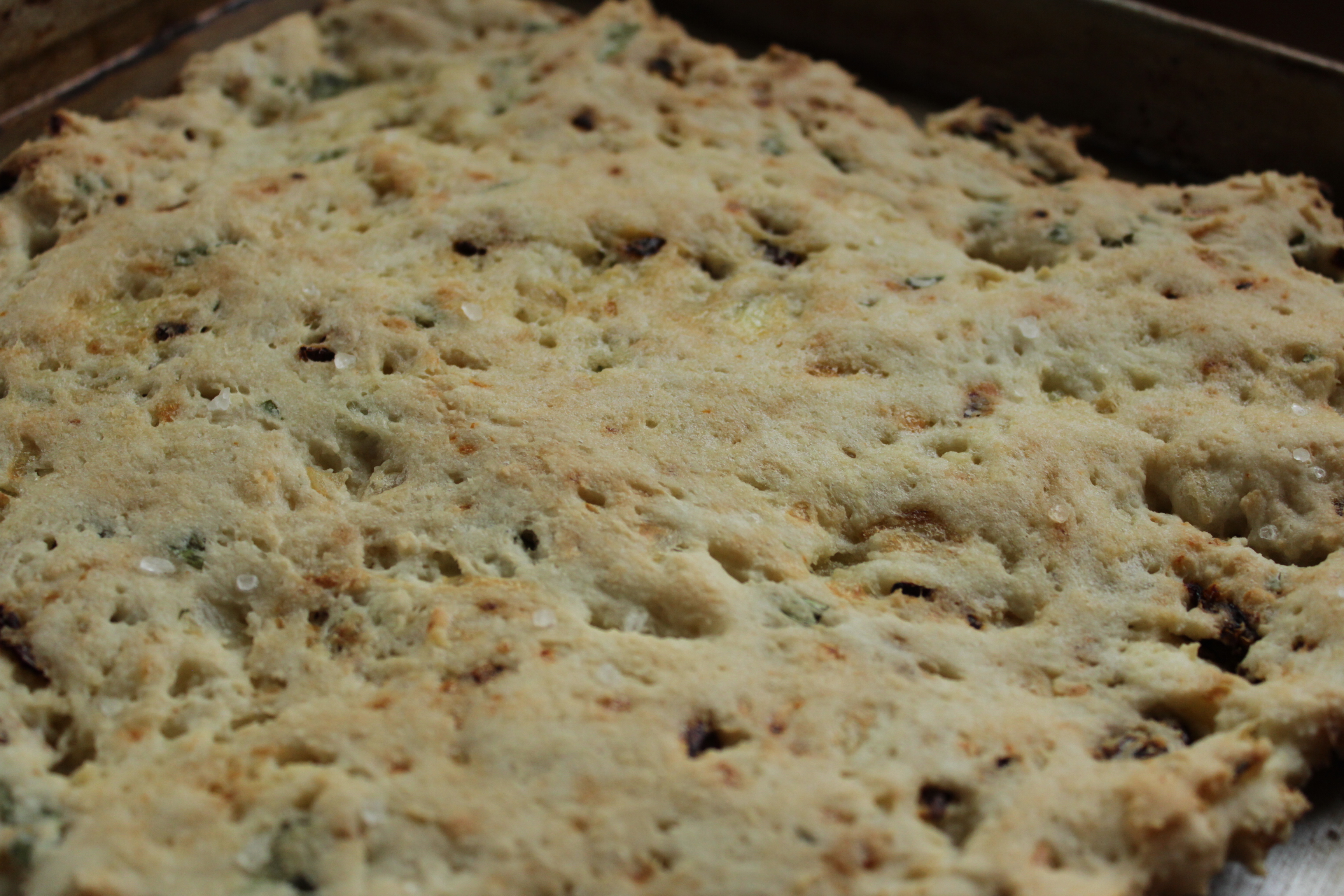 6. Pour the dough onto the center of the baking sheet and spread to all four corners with the back of a spoon or rubber spatula. Before baking, spritz with a little bit more oil and a sprinkle of course sea salt.