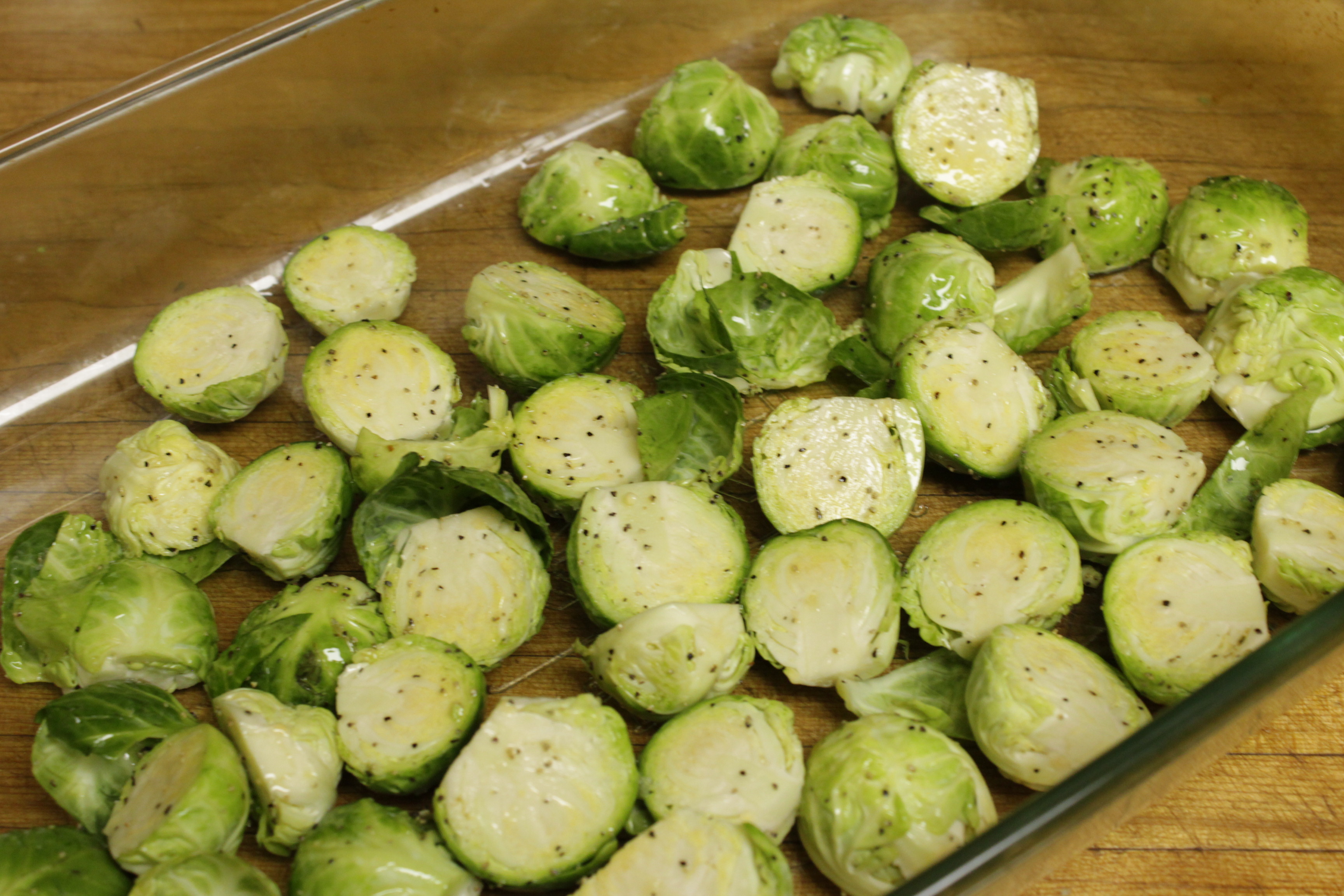 3. Toss the Brussels sprouts in a large bowl with oil, salt, and pepper. Spread out in a 13 by 9 inch baking dish.